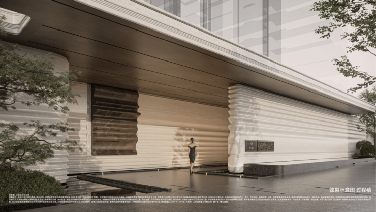 材质:局部温润石材、仿铜铝板、仿石铝板及局部仿石涂料,竖向铝板提升品质感
