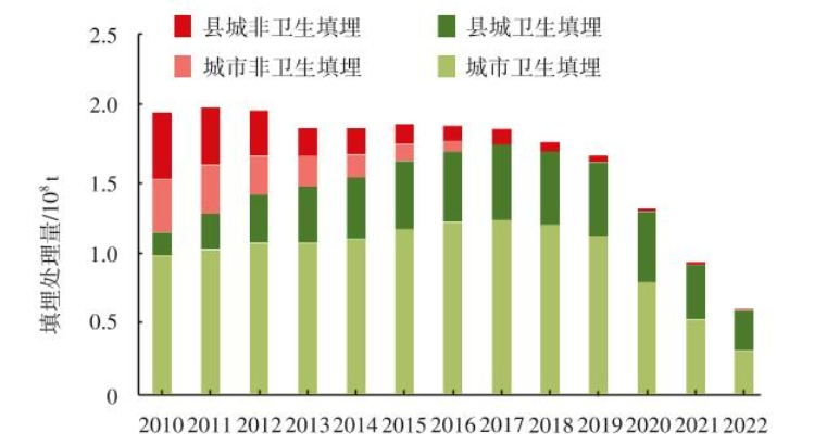 对我国生活垃圾填埋处理发展状况进行分析,结果表明:2010-2022年,我国卫生填埋场的数量和生活垃圾填理PG电子平台量均呈现下降趋势。在填埋处理发展过程中,填埋场渗滤液处理属于薄弱环节之一,需重点关注。