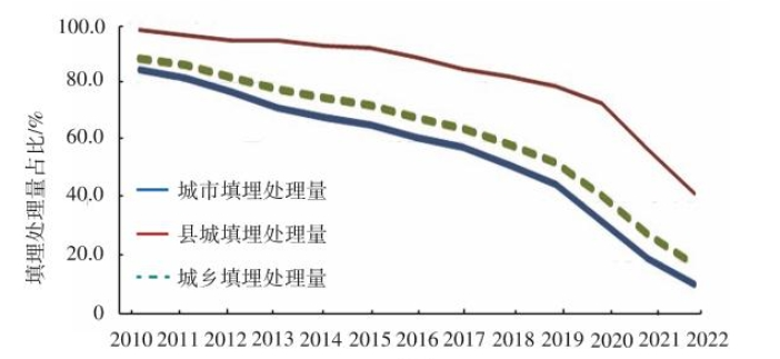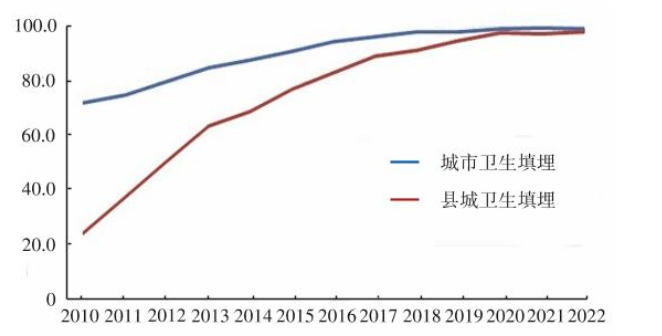 目前,我国内地运行的生活垃圾填埋场大多达到卫生填埋场建设要求。2010年城市生活垃圾卫生填埋场在全部城市填埋场的占比为72.1%,县城生活垃圾卫生填埋场占全部县城填埋场的比例为24.9%;2018年分别提高至98.0%和91.5%;2022年城市、县城生活垃圾卫生填埋场占其全部填埋场的比例均为98.0%以上(图3)。