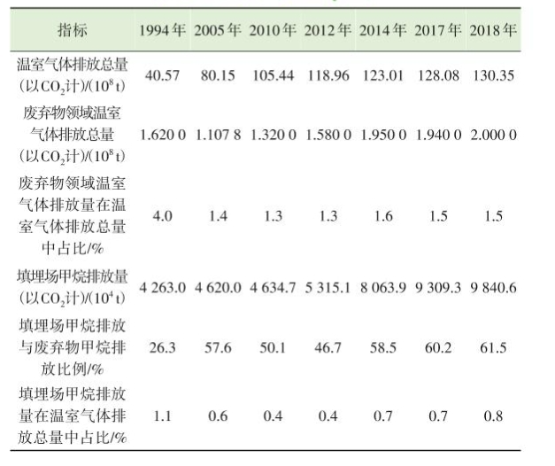 根据中华人民共和国气候变化初始国家信息通报(2004年)、中华人民共和国气候变化第一次两年更新报告(2016年12月)、中华人民共和国气候变化第二次两年更新报告(2018年12月)、中华人民共和国气候变化第三次国家信息通报(2018年12月)、中华人民共和国气候变化第四次国家信息通报(2023年12月),我国废弃物领域温室气体排放量在温室气体排放总量中占比约为1.5%(1994年为4%),明显低于其他国家以及全球平均水平。