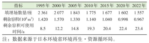 保障填埋场合理剩余容量可以避免规划建设应急填埋场,提高生活垃圾处理的韧性。根据日本环境部统计,1995-2022年日本生活垃圾填埋场数量虽然从2361座减少至1557座,填埋场剩余容积从 1.420x108m3降为9.670x107m3,但填埋剩余容积的使用年限却从85a提高到23.4a,如表12所示。