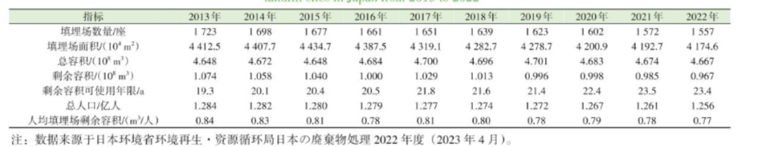 表 13 2013-2022 年日本垃圾填埋场数量、占地面积、剩余容积及人均剩余容积等统计数据