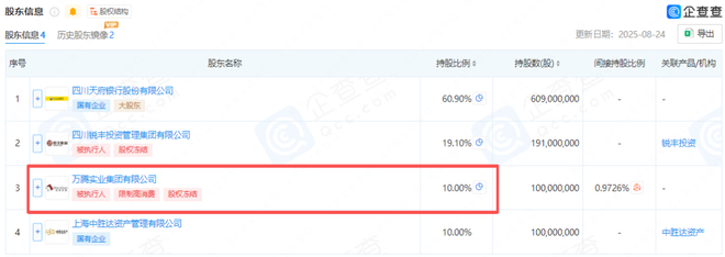 企查查显示, 万腾实业成立于2006年, 注册地位于四川省成都市, 注册资本 3.715亿元, 所属行业为房地产业。经营范围包含:项目投资;房地产开发;商品批发与零售;房屋租赁等。股权结构方面,大股东成都三腾投资控股有限公司持股53.8358%,前法定代表人吴昊持股46.0794%,现法定代表人周郁珩持股0.0848%。