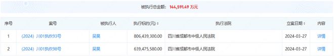 同年3月24日,四川省成都市中级人民法院公布的两则被执行人信息显示,吴昊被执行总金额已高达14.459亿元。