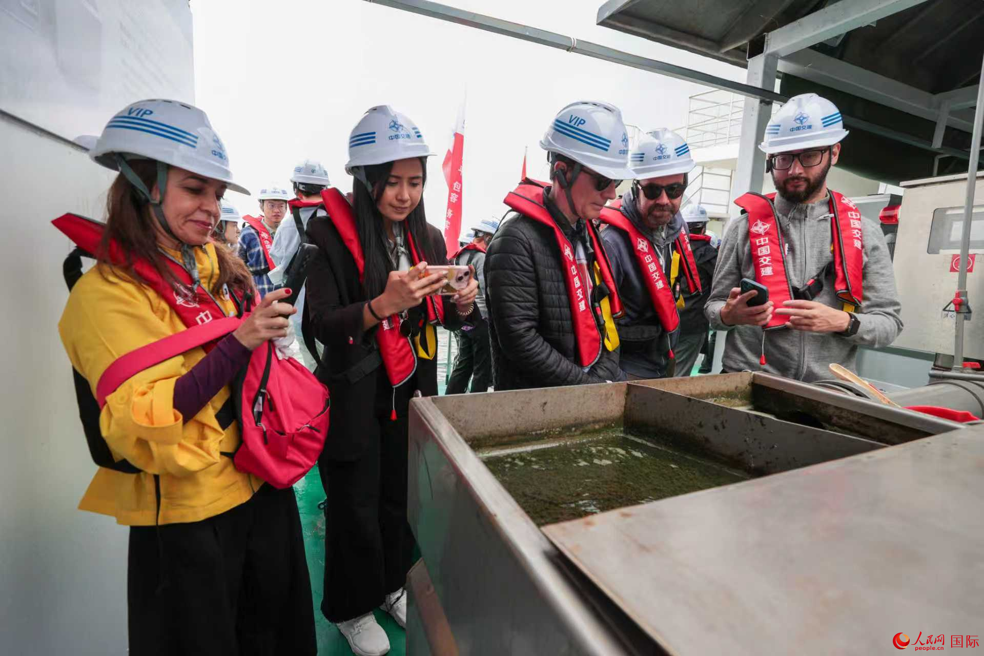 2025“一带一路”媒体合作论坛中外媒体联合采访团的外媒记者正在拍摄“藻水共治”一体化平台过滤产生的藻泥。人民网记者 张武军摄