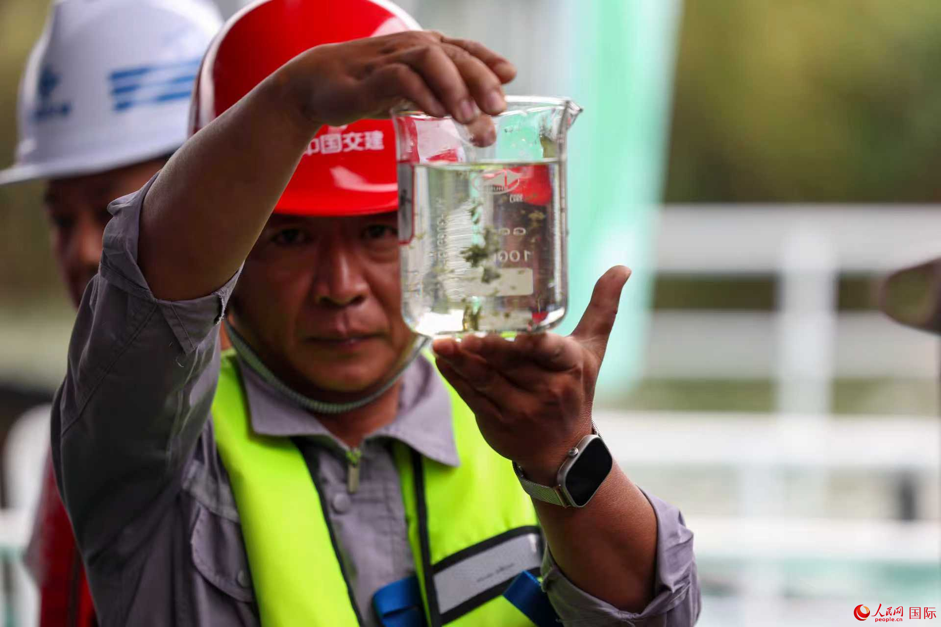 工作人员向2025“一带一路”媒体合作论坛中外媒体联合采访团展示蓝藻从水中分离的技术。人民网记者 张武军摄