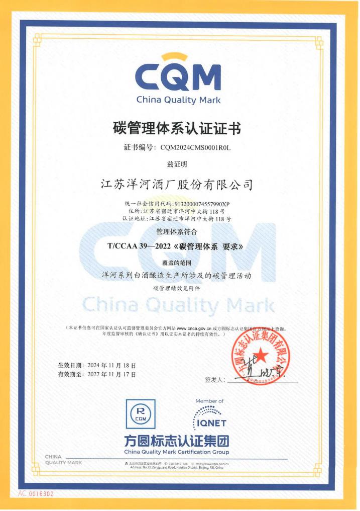 以全面提升公司碳排放管理能力为导向,探索碳管理工作系统化、体系化。洋河深入研究政策趋势、行业需求,率先谋划导入碳管理体系建设及认证。遵循“策划—实施—检查—改进”(PDCA)的基本逻辑和持续改进的管理原则,基于“监测、报告、核查”(MRV)碳管理模式,在组织、产品、项目、活动等不同维度制定符合企业实际的碳管理措施。顺利完成碳管理体系方案编制、导入建设、运行评价等工作。成为行业第一家将碳排放管理工作体系化运行并通过权威第三方认证的白酒企业。助力洋河在国内外碳政策、碳机制的大背景下,持续提高竞争力,为实现“双碳”目标奠定管理基础。